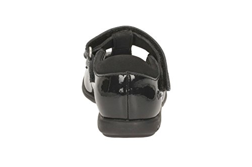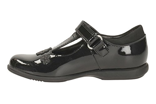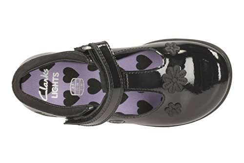 These girls' school shoes team glossy black patent with flower detailing. A heart sock print and flashing Lights that can be turned on and off add extra fun, while the durable rubber sole is perfect for the playground. A riptape fastening secures the foot, while padded toplines offer comfort and support and Agion linings keep feet fresh throughout the day. Available in whole and half sizes and a choice of widths. Click here to book a fitting appointment at your local store.